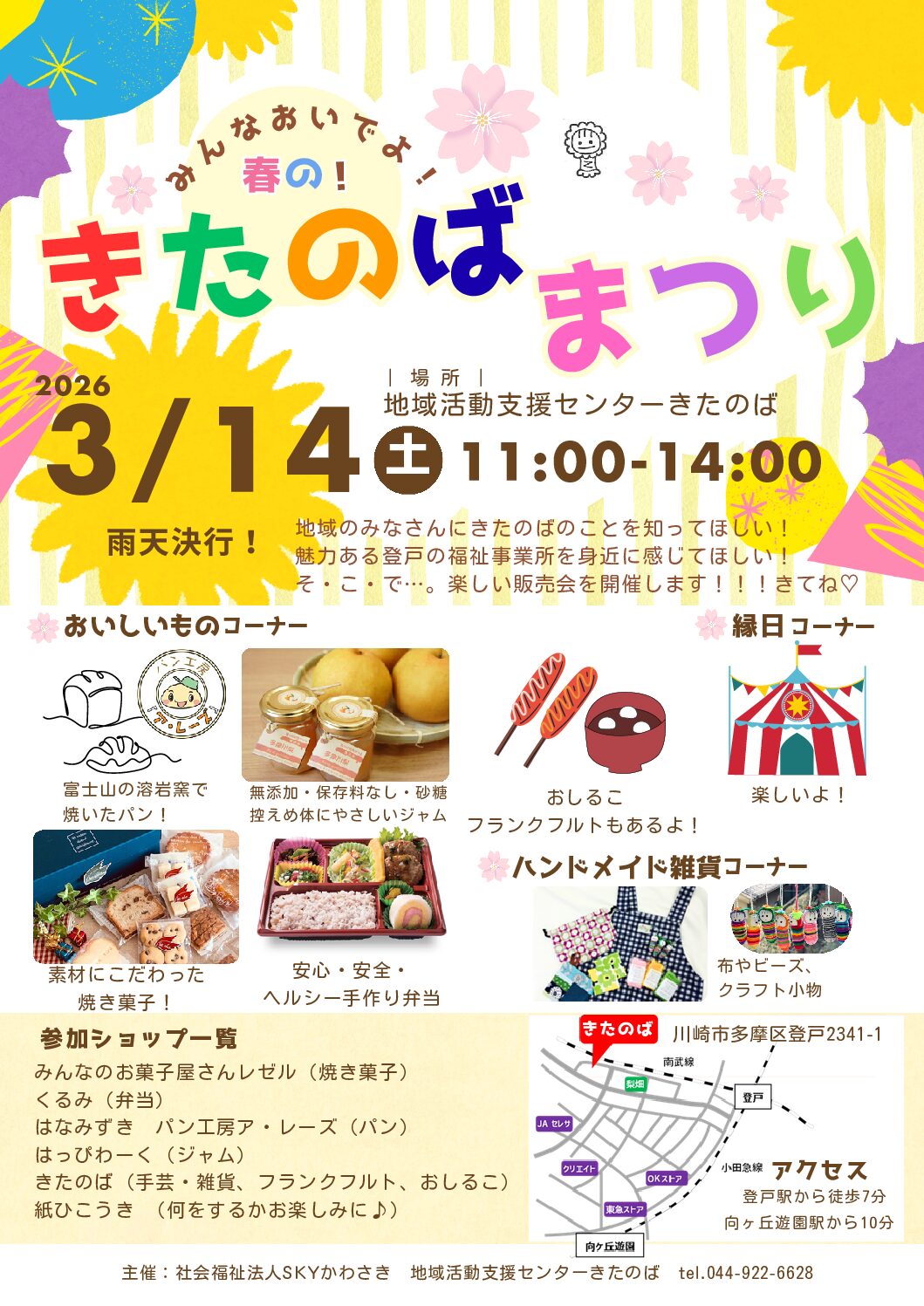 【あゆ工房】焼き菓子出店のお知らせ せせらぎスタッフ–出店・販売情報–2026-02-25 「きたのばまつり」に出店いたします。 日時:2026年3月14日(土)11時00分~14時00分 場所:地域活動支援センターきたのば(川崎市多摩区登戸2341-12) みなさまのお越しをお待ちしております。 詳しくはチラシをご覧ください。